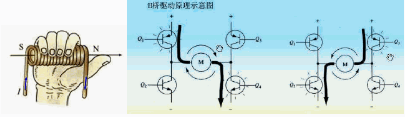 3.有了前面的感官認(rèn)知,方便后續(xù)講解,希望大家不要嫌棄羅嗦,畢竟每個(gè)人的情況不一樣,我們要盡可能多的照顧更多的人,其實(shí)單相電機(jī)控制--就是利用H橋(4個(gè)MOSFET)來控制電磁鐵(定子)磁場。根據(jù)右手螺旋定則可知,不同的電流方向,會(huì)得到不同的磁場極。利用H橋來實(shí)現(xiàn)電流換相,最終得到不同的磁極,從而達(dá)到同極相斥,異極相吸的目的,如下圖所示:當(dāng)Q1Q4導(dǎo)通時(shí),電流從左向右流動(dòng);當(dāng)Q2Q3導(dǎo)通時(shí),電流從右向左流動(dòng)。