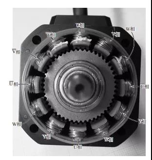 這里將上、下、左、右互相間隔 90°的 4 個(gè)主極稱為 U 相,在 2 個(gè)方向上分別 與它們間隔 30°的稱為 V 相和 W 相,線圈就按照這三相來(lái)布置。各相中相對(duì)的兩極 的磁性相同,間隔 90°的兩極的磁性相反,定子的主極相位順序如下:U → V → W → U → V → W → U → V → W → U → V → W 主極之間的 30°夾角與小齒之間的 7.2°齒夾角之間的關(guān)系可以表示為 30 = 7.2×4 + 1.2 = 7.2× 4 + 16 (9.3) 因此,相鄰主極之間的相位差為 1/6 夾角(電氣角 60°,機(jī)械角 1.2°)。