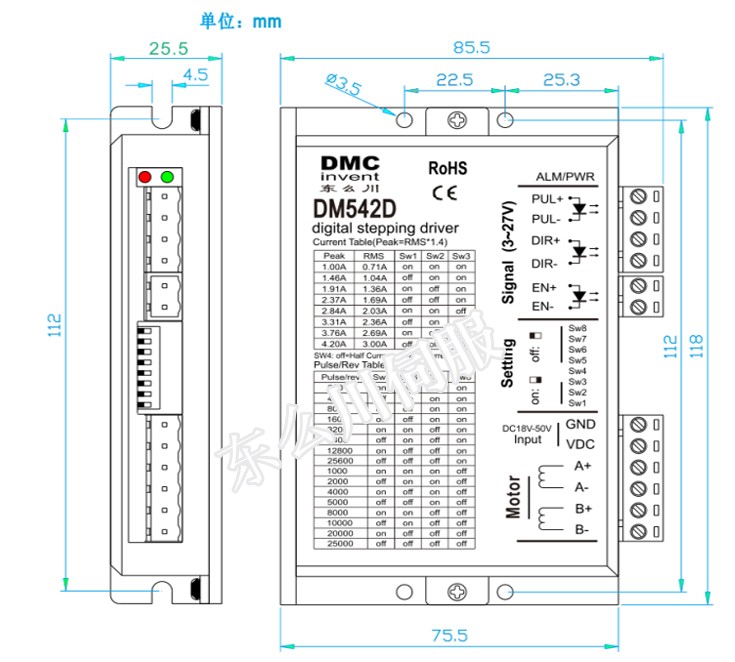 DM542D型驅動器,比DM542A具有更低的電機發熱、運行噪聲和更高的平穩性,以及更低的成本,主要驅動42、57型兩相混合式步進電機。其微步細分數有15種,最大步數為25000Pulse/rev;其工作峰值電流范圍為1A-4.2A,輸出電流共有8檔,電流的分辨率約為0.45A;具有自動半流,過壓和過流保護等功能。本驅動器為直流供電,建議工作電壓范圍為24VDC-36VDC,電壓不超過50VDC,不低于20VDC。