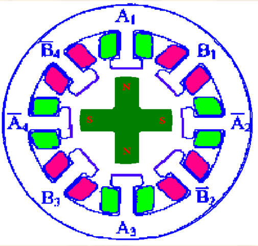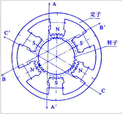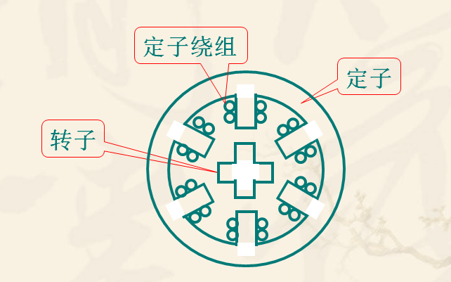 定子和轉子。它們均由磁性材料構成,其上分別有六個、四個磁極 。 定子的六個磁極上有控制繞組,兩個相對的磁極組成一相。